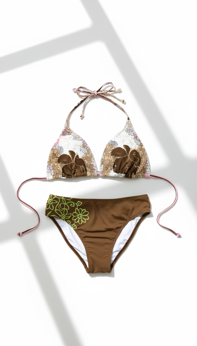 Indulge in comfort and style with this captivating two-piece ensemble. The halter-neck top features a shimmering abstract floral pattern in shades of brown, white, and gold, while the solid dark brown brief is graced with a delicate green floral embroidery on the left hip. Made with an extra soft fabric, this set is incredibly comfortable and designed to be best for all sizes. It’s the perfect choice for romantic evenings where both elegance and ease are a must.